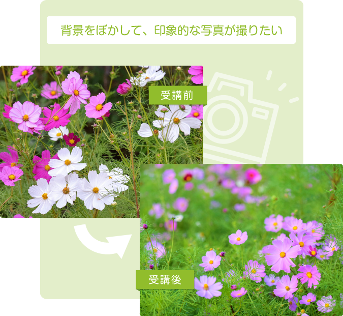 - ※ コンパクトデジタルカメラでの受講も可能ですが、レッスンの内容は一眼レフまたはミラーレス一眼を対象とした講座内容となっております。